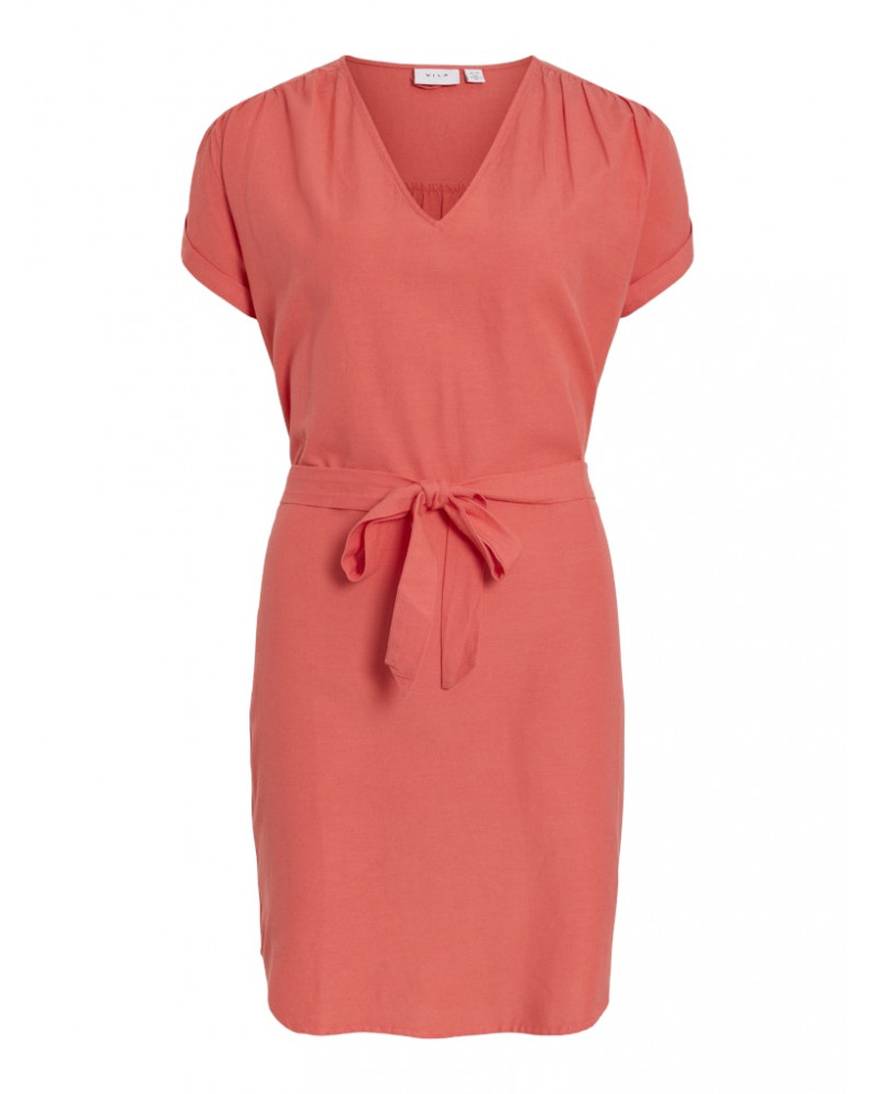 Woven fabrics are more durable and less likely to lose their colour. - Product Type : Dress - Neck : V-Neck - Sleeve : Short sleeves - Length/Size : Short - Extra details : Belt in waist - Fit : Regular Fit